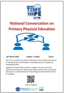 Join SATPE and SERA for an online conversation to help shape a new Scotland‑wide primary PE network aimed at protecting time, clarifying purpose, and supporting meaningful practice. Together we’ll hear brief provocations, engage in discussion and share experiences of primary PE, explore what support teachers need, and identify next steps for a national Primary PE network aligned with the SATPE Make Time for PE campaign.