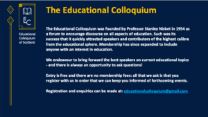 The Educational Colloquium was founded by Professor Stanley Nisbet in 1954 as a forum to encourage discourse on all aspects of education. Such was its success that it quickly attracted speakers and contributors of the highest calibre from the educational sphere. Membership has since expanded to include anyone with an interest in education.